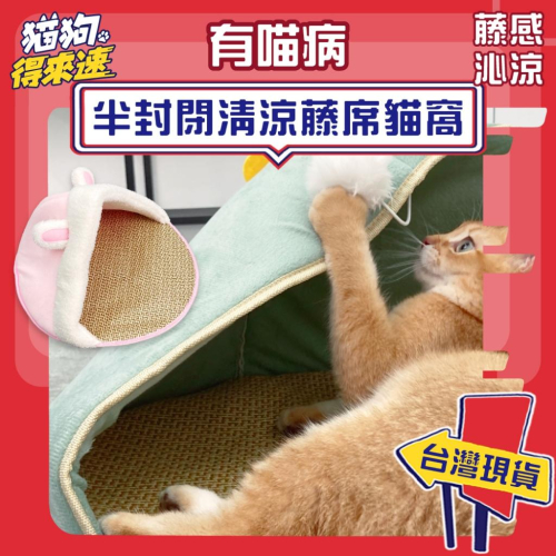 台灣現貨貓狗得來速 半封閉清涼藤席貓窩 兔子恐龍 夏季 涼墊 寵物