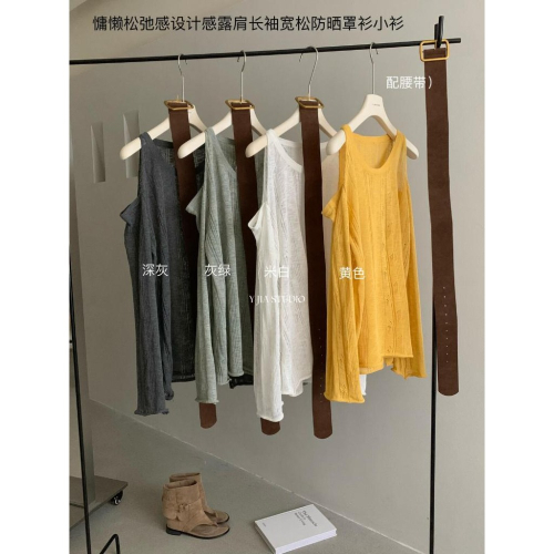 貓町選品🐯J3002 【配腰帶】防曬背心女 夏季寬鬆露肩上衣 文藝慵懶風 輕薄透氣防曬罩衫 深灰/灰綠/米白/黃色