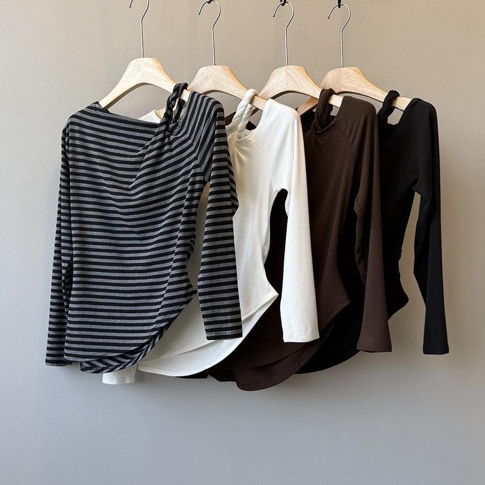 貓町選品🐯Y82572【設計感】秋季 不對稱領口長袖上衣 女 修身顯瘦 韓系百搭 條紋/白/咖/黑