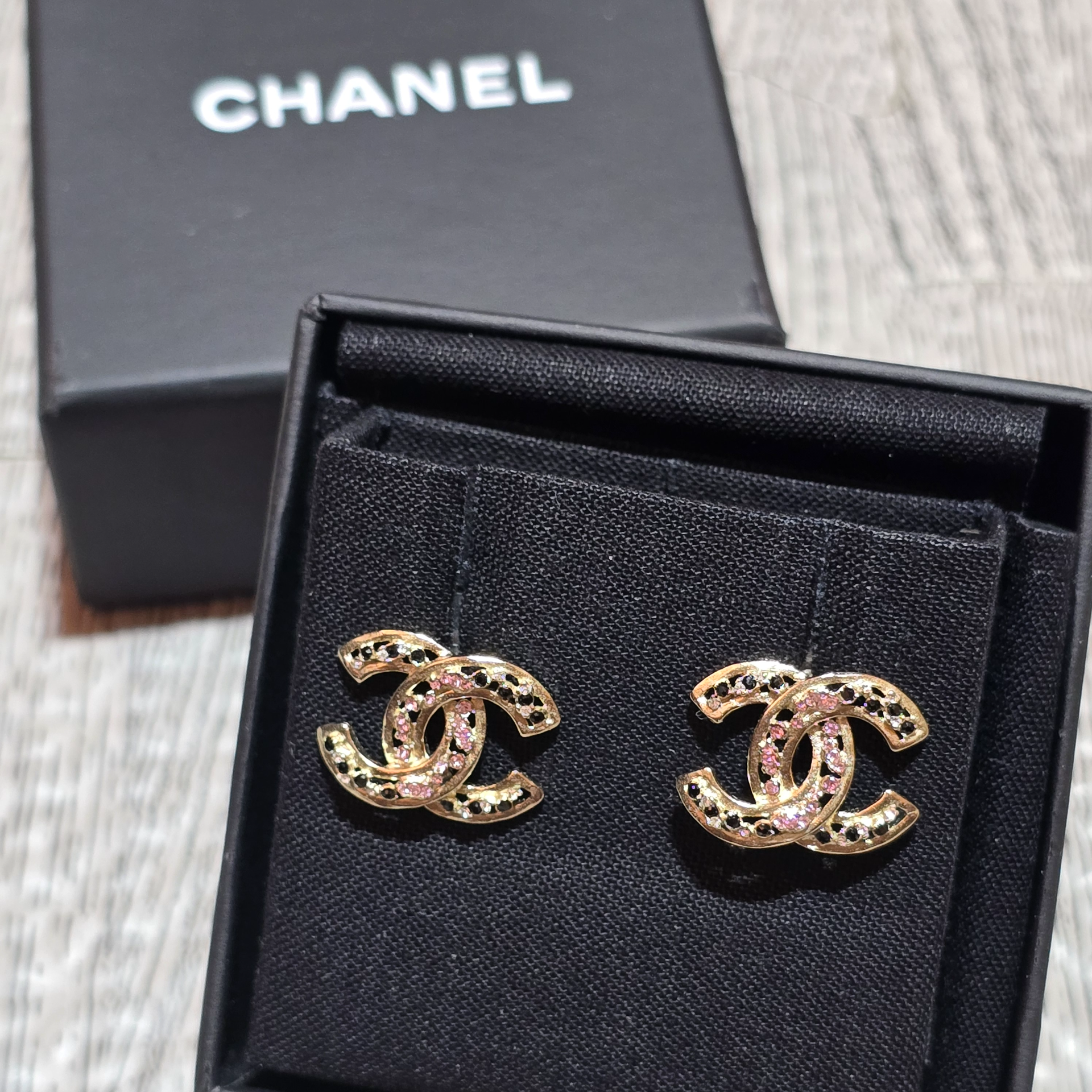 【輕鬆購精品百貨】CHANEL 香奈兒 雙C 粉黑拼鑽金色耳針 耳環
