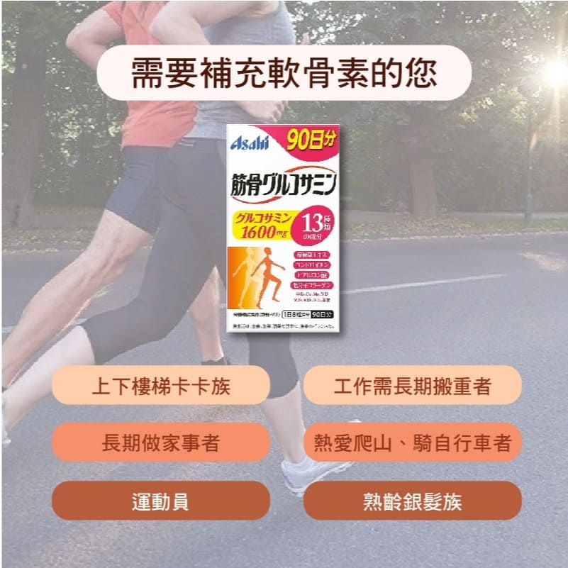 高品質日本商品,專為關心健康的您而設計。這款營養功能食品含有全13種珍貴成分,包括1,600mg的葡萄糖胺、筋骨草萃取物、軟骨素、透明質酸、低分子膠原蛋白、鋅、鈣、鎂、維生素D、維生素B1、維生素B6、維生素E和葉酸。