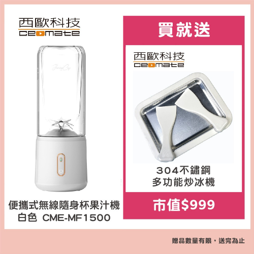 【西歐科技】便攜式無線隨身杯果汁機(白色)CME-MF1500 贈西歐科技 304不銹鋼多功能炒冰機