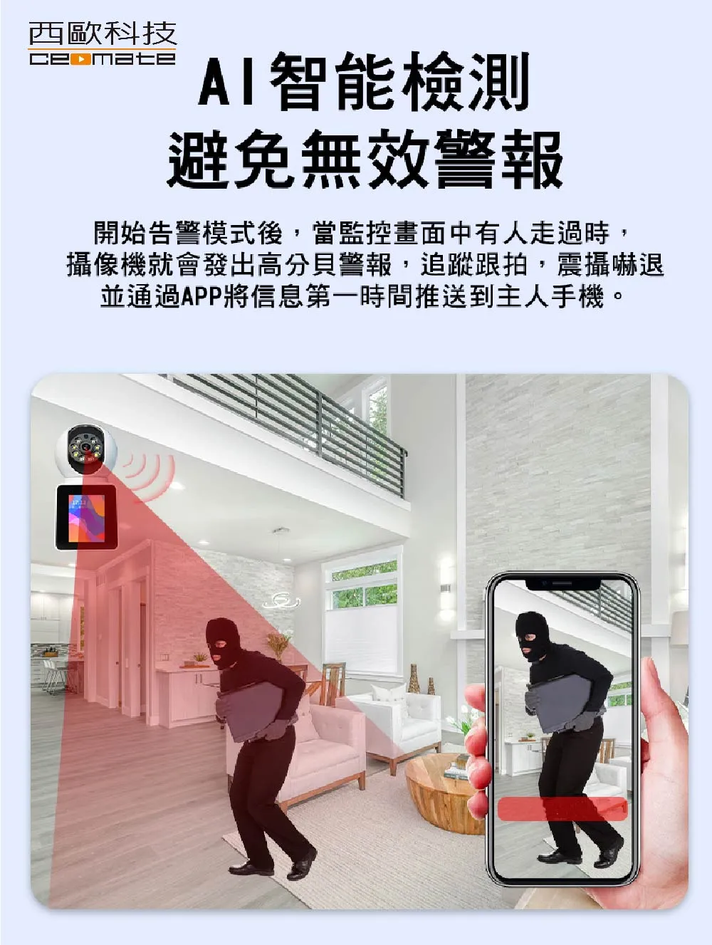 · 搭載人形偵測追蹤功能,異常狀況即時推播通知