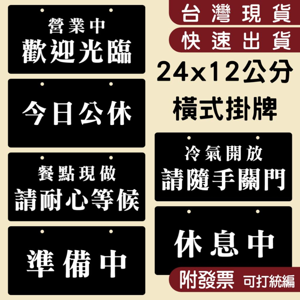 https://s-cf-tw.shopeesz.com/file/tw-11134208-7ra0g-mbbv3gy33n88da 每日營業狀態,一目了然 讓顧客一眼就知道你今天有沒有開!這款多功能營業掛牌專為店家日常需求設計,內含多種常用狀態標語:「歡迎光臨」、「營業中」、「休息中」、「本日公休」、「現點現做請耐心等候」,從開門迎客到結束營業,一組就能全方位應對。 適用於咖啡廳、小吃店、美甲店、工作室等各式商業空間,搭配珠鏈與無痕掛勾貼,即可輕鬆懸掛於門口、櫃台或玻璃門,讓門市形象更專業,日常營運更有條理! 尺寸:24x12公分 厚度:3 mm厚 材質:黑色植纖板 (勿淋雨或泡水) 油墨不怕水,但請勿用硬物刮碰 【附贈】 珠鏈、無痕掛勾貼 ❈ ❈ ❈ 若需客製內容,請下單《客製化內容》選項,並告知客製文字內容,我們會排版跟您確認。 #歡迎光臨 #今日公休 #休息中 #請耐心等候 #準備中 #隨手關門 #營業中 #掛牌 #吊牌 #警語 #告示牌 #標語 #餐點現做 #現做 #標誌 #彩色標語 #警示標語 #餐飲標語 #餐飲用品 #餐飲 #擺攤用品 #擺攤道具 #擺攤 #餐車 #現做咖啡 #角鋼餐車 #餐廳掛牌 #餐廳