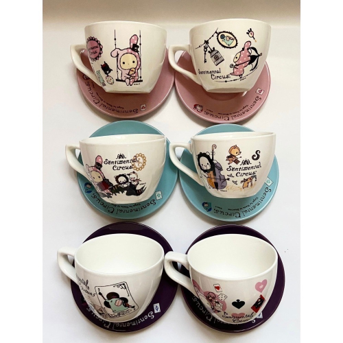 日本 San-X 出品的「Sentimental Circus 深情馬戲團」系列,以獨特復古風馬戲團為主題,推出夢幻咖啡杯盤組。每組包含精緻陶瓷杯與對應色系杯盤,設計以團長兔子、獅子、大象、小貓等角色為靈感,呈現柔和的馬卡龍色調與典雅花紋,收藏價值極高。