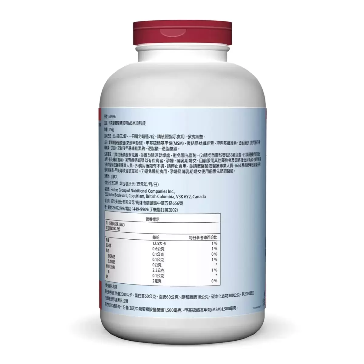 | 成分 | 葡萄糖胺鹽酸鹽(來源甲殼類)、甲基硫醯基甲烷(MSM)、微結晶狀纖維素、羥丙基纖維素、透明膜衣 (羥丙基甲基纖維素、甘油)、交聯羧甲基纖維素鈉、硬脂酸、硬脂酸鎂。 |