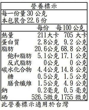 | 過敏原資訊 | 本產品含堅果類製品,食物過敏者請 留意。 |