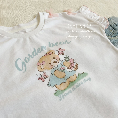這款T恤充滿了童趣和夢幻感,胸前印著抱著花束的花園小熊,小小的蝴蝶結和粉嫩的花邊點綴在袖口,每一個細節都超可愛!