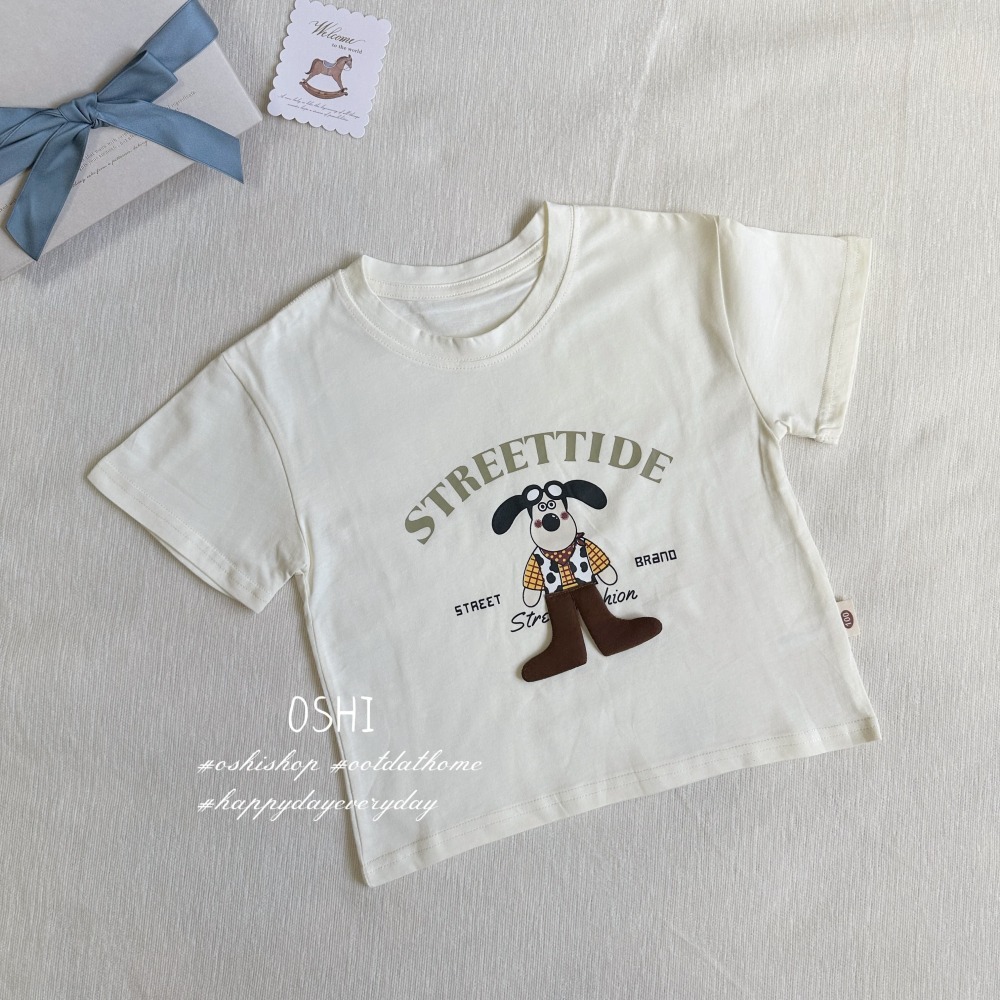 米白色的T恤乾淨又百搭,中間印著一隻戴著飛行眼鏡的帥氣狗狗,牠穿著格紋襯衫和吊帶褲,準備上街展現時尚!最酷的是牠腳上那雙立體的咖啡色鞋子超級可愛。