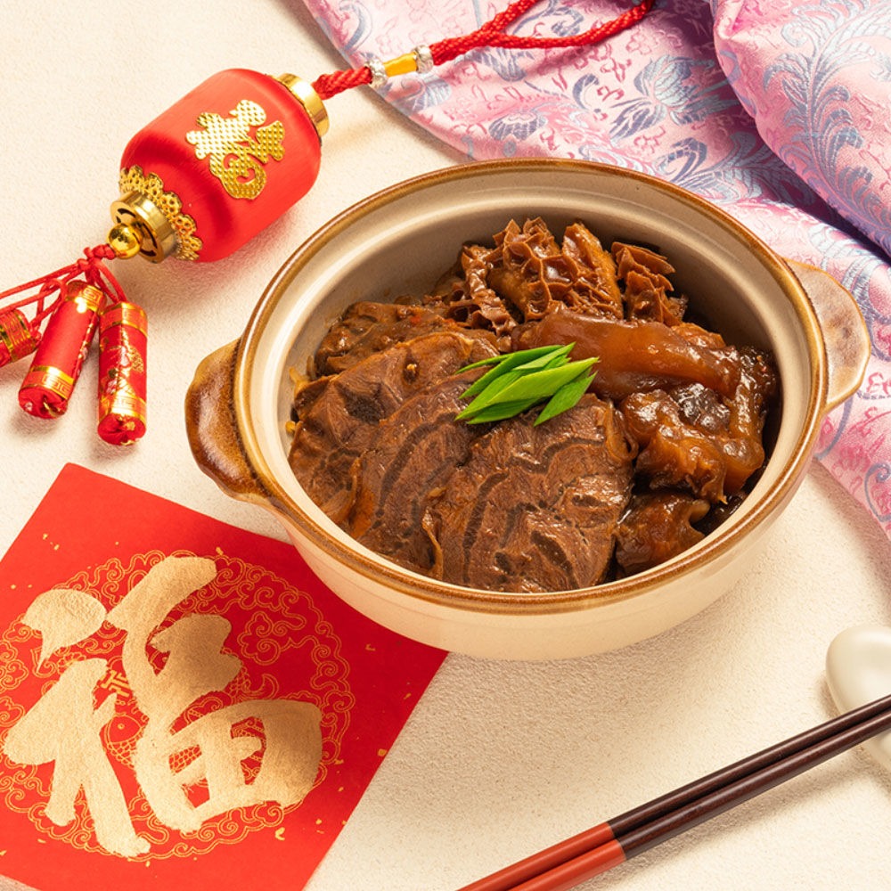 滷牛三寶 使用安心澳洲草飼牛肉,將辛香料以牛油爆香後加入牛腱、牛肚、牛筋, 並以獨家調配中藥湯底滷製醬汁, 將食材依特性依序燉煮入味。