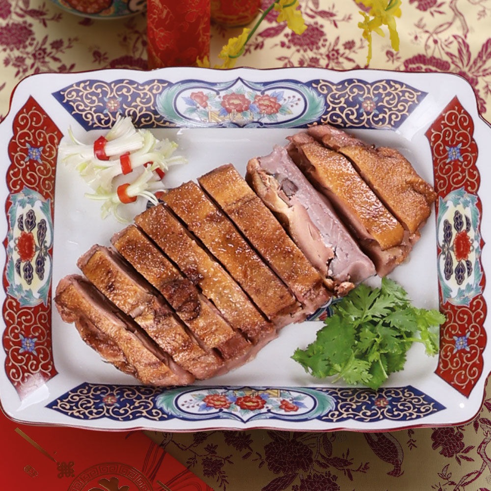這是一道功夫手工菜,先將全鴨以多種辛香料和酒醃漬數小時,去除鴨腥味,然後蒸炊入味,趁熱片下整塊多汁的鴨肉,佐以精心調配之大甲檳榔心芋泥餡,芋芯鬆軟,油炸之後口感外酥脆內綿密,淡淡芋香襯托鴨肉的鮮美,而鴨肉也大有來頭,是選用法國(品種)土番鴨,肉質甘甜,採自然飼養法,在飼料中添加益生菌,不施打藥物,還有駐廠獸醫師檢驗,吃得安心有健康。