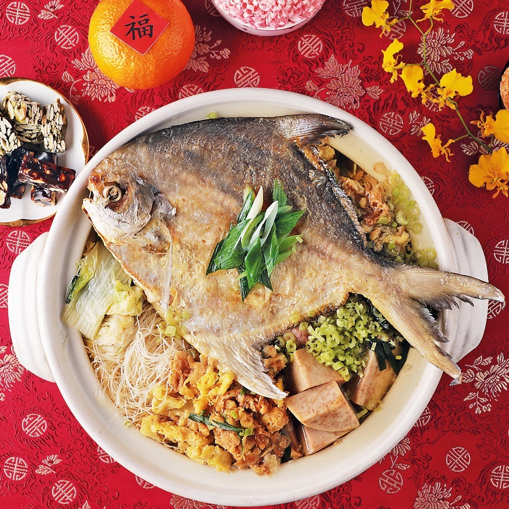 GREEN & SAFE 與山海樓聯名開發,以當季現流白鯧為主角,嚴格挑選漁民出海捕獲的野生白鯧,經去除內臟等作業後急速冷凍,封存野生漁獲的原始鮮美風味!以放山雞骨架、柴魚片及新鮮文蛤汁做為高湯底,搭配炸白鯧口感細緻鮮甜,及當令蔬菜等安心食材,最後加入100%純米米粉及自製油蔥酥,吸收所有食材的鮮香精華,每個入口都是滿足,且寓意圓滿,象徵著未來的一年運勢昌盛!