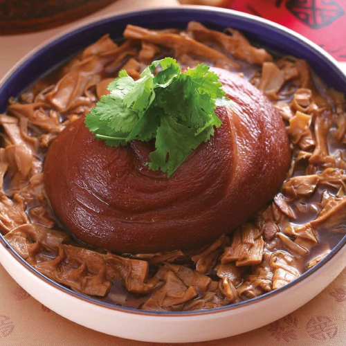 遵循古早傳統做法,細火熬煮三小時以上,待蹄膀滷的香濃入味後,再用滷汁將筍乾滷入味。蹄膀肉質Q 軟卻不油膩,外皮彈牙富有膠質,筍乾爽脆。麻竹筍經殺菁發酵後,以人工翻面曝曬讓筍乾成自然褐黃並散發濃厚筍香,搭配出最經典的美味。