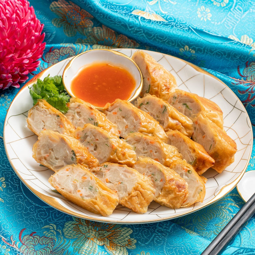 古早味雞捲 是宴席辦桌上常見的經典菜色,也能作為日常的美味點心。嚴選台灣正黑豬肉和洋蔥分別醃漬,直到豬肉入味及洋蔥軟化後,再拌入自家調配的旗魚漿和荸薺、豆薯和胡蘿蔔等多種蔬菜增添爽脆口感,接者將細打的澎湖日蝦乾和紅蔥頭炒至金黃黃酥,加入五香粉、白胡椒、香油拌勻入餡,最後以豆腐皮細緻包裹。遵循古法、層層工序悉心製作,完整保留辦桌菜的傳統特色與滋味。
