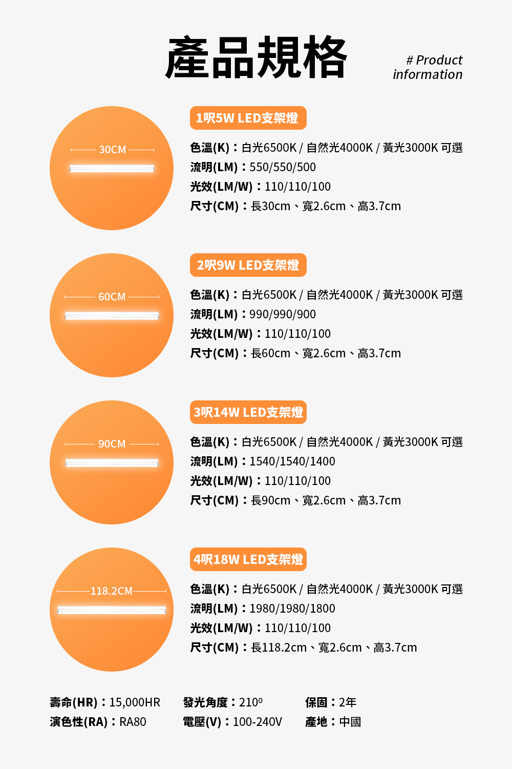 ※四呎/功率:18W 流明(lm):1800lm