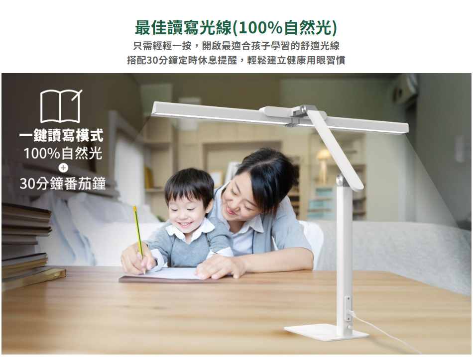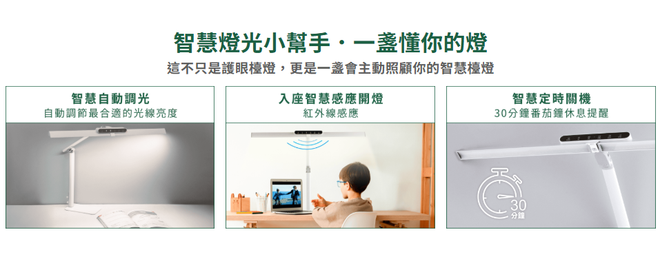 搭載智慧功能,可自動調節亮度,支援自動感應開關燈、定時關燈功能、一鍵開啟最適合學習的舒適光線