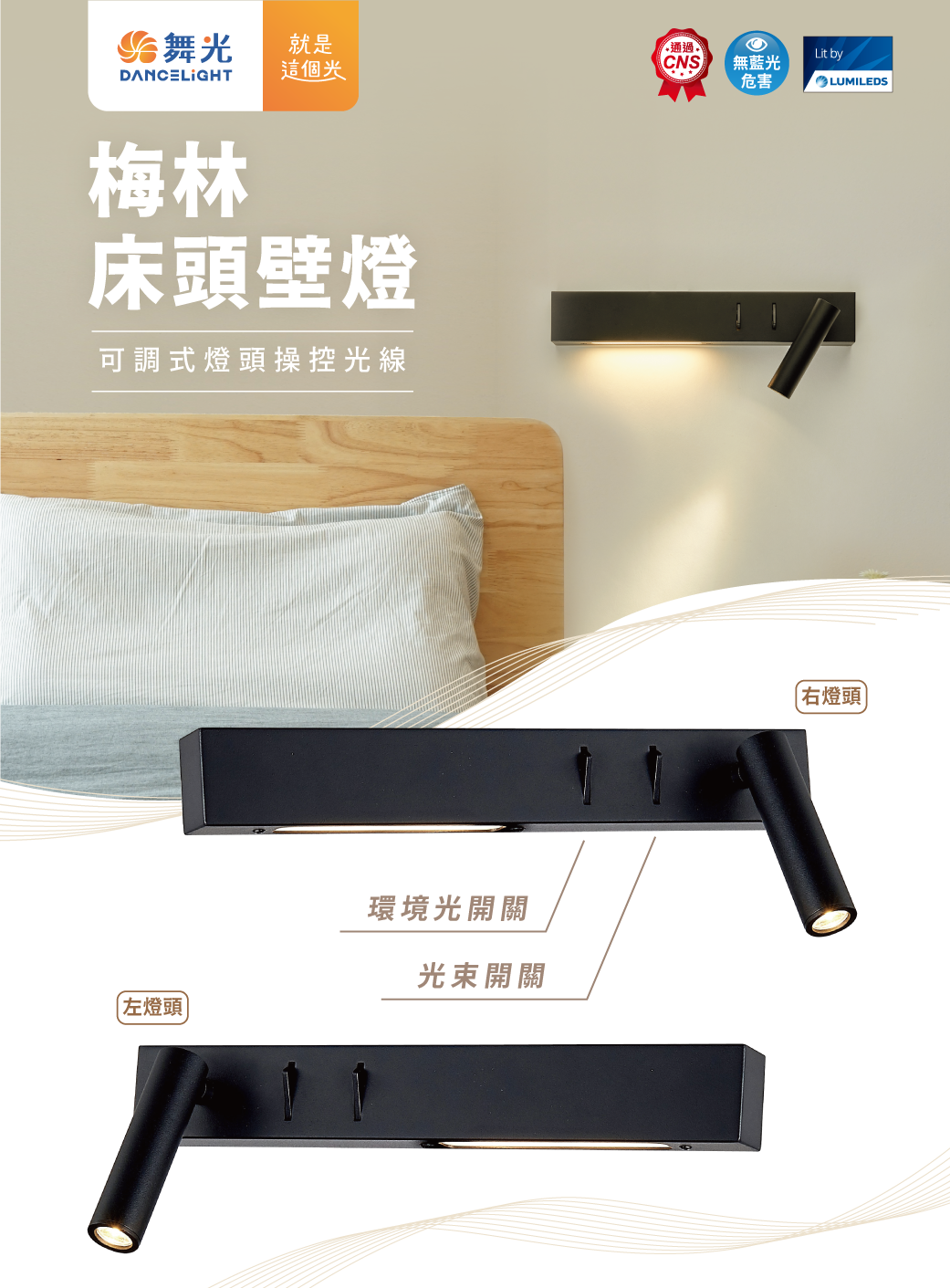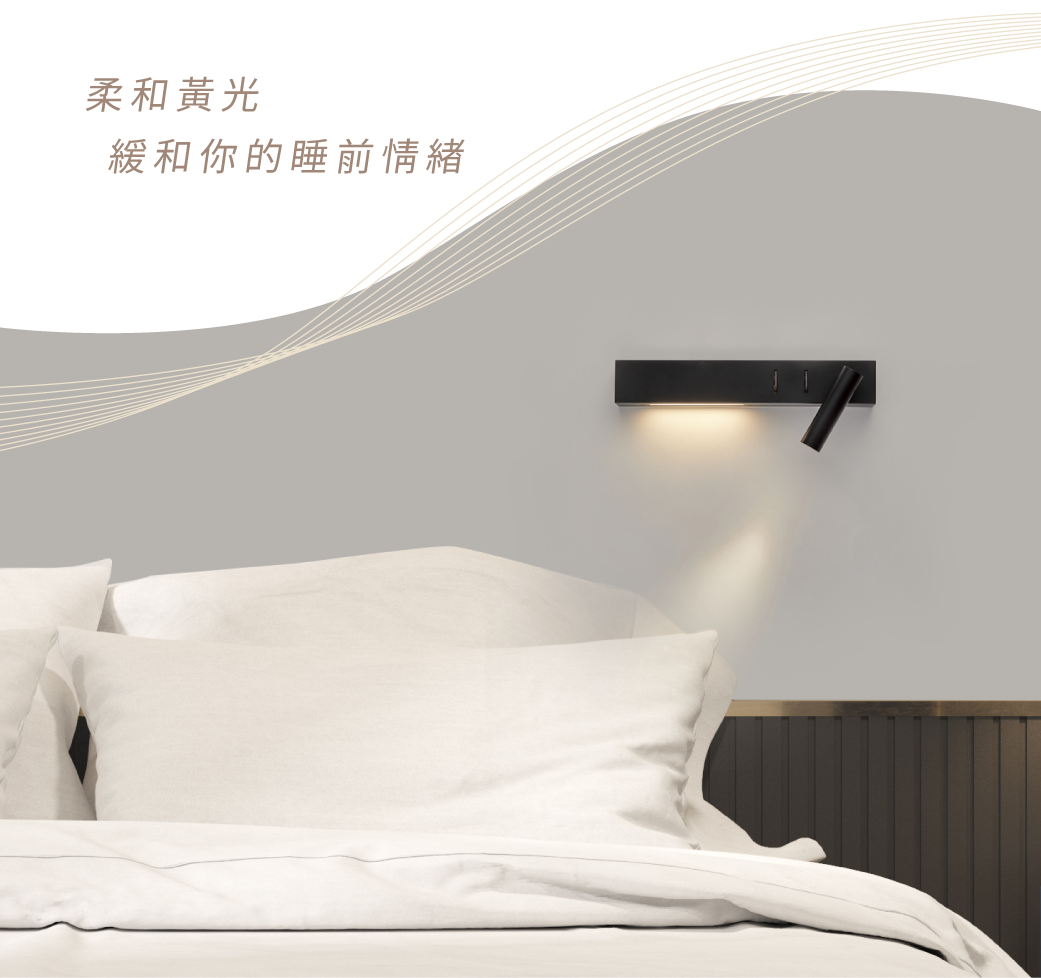 結合重點光束及環境光設計 燈體附雙開關,輕鬆切換 燈頭可隨需求調整角度 柔和黃光緩和你的睡前情緒❤️