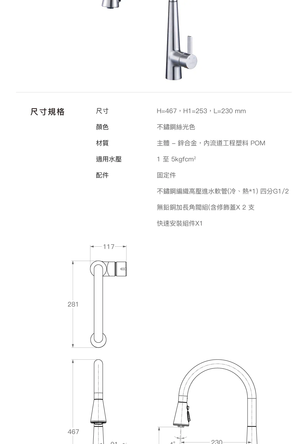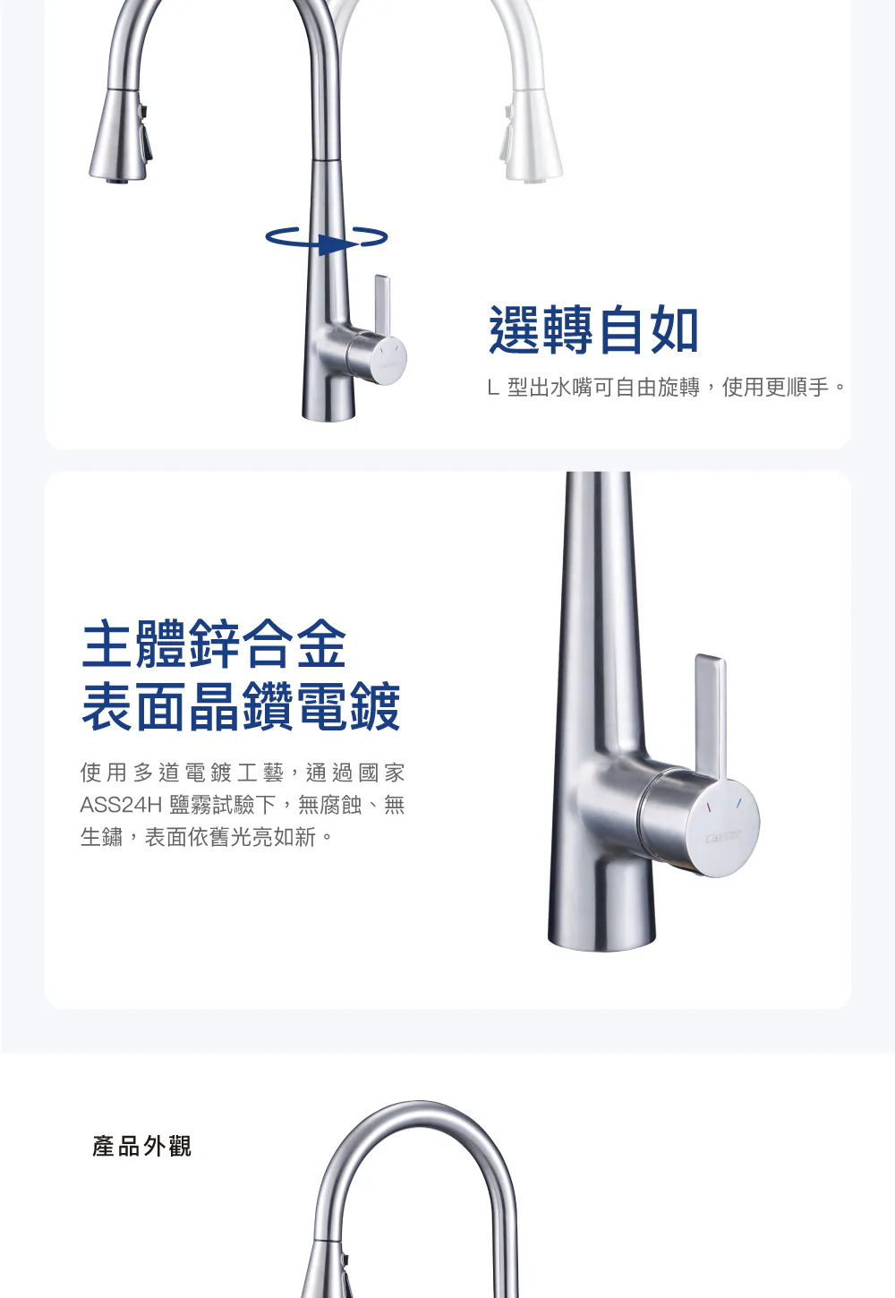 🔸鵝頸式 - 帶抽拉設計,出水嘴可旋轉,便於洗滌大型鍋碗瓢盆