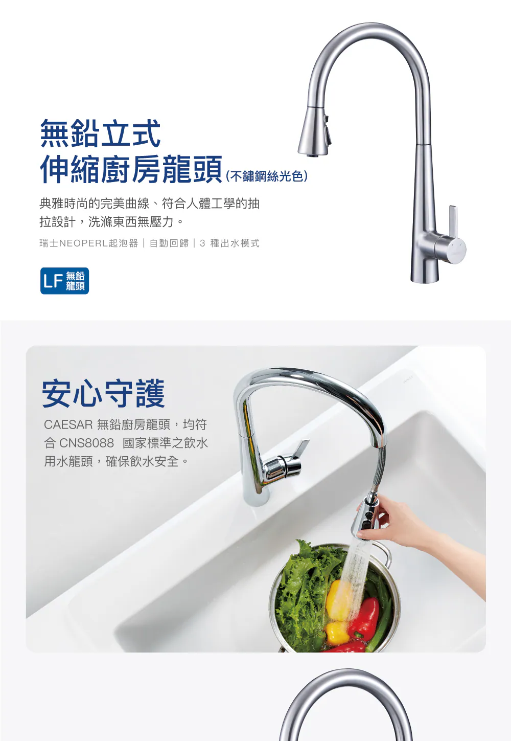 品名 : Caesar 凱撒 無鉛立式伸縮廚房龍頭
