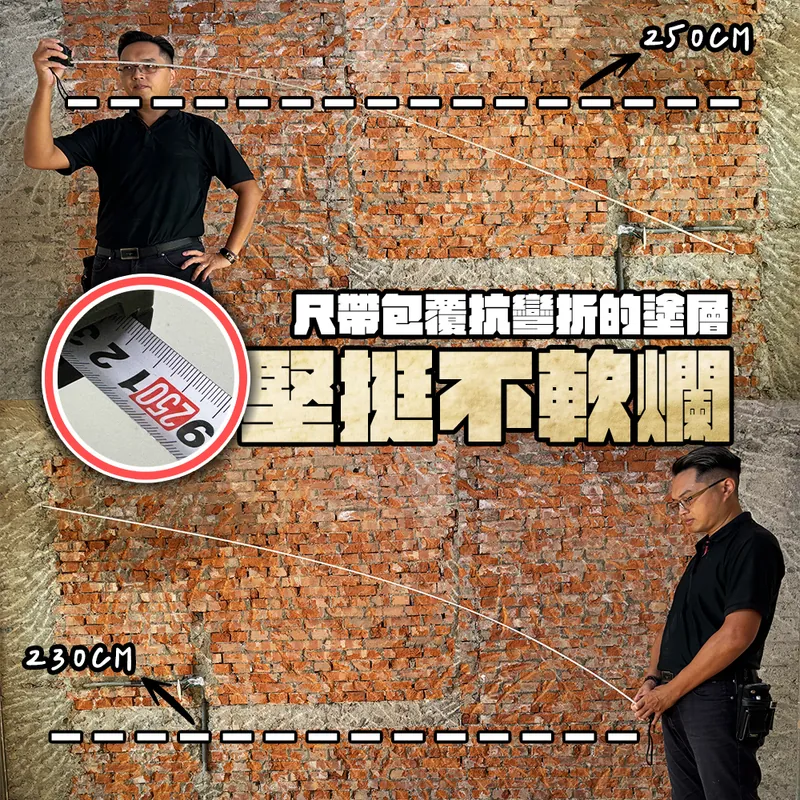 尺帶表面覆有特殊抗彎折塗層,最大化尺帶伸展性,可在不彎曲的情況下達到250cm測量長度。瞬間停止控制按鈕