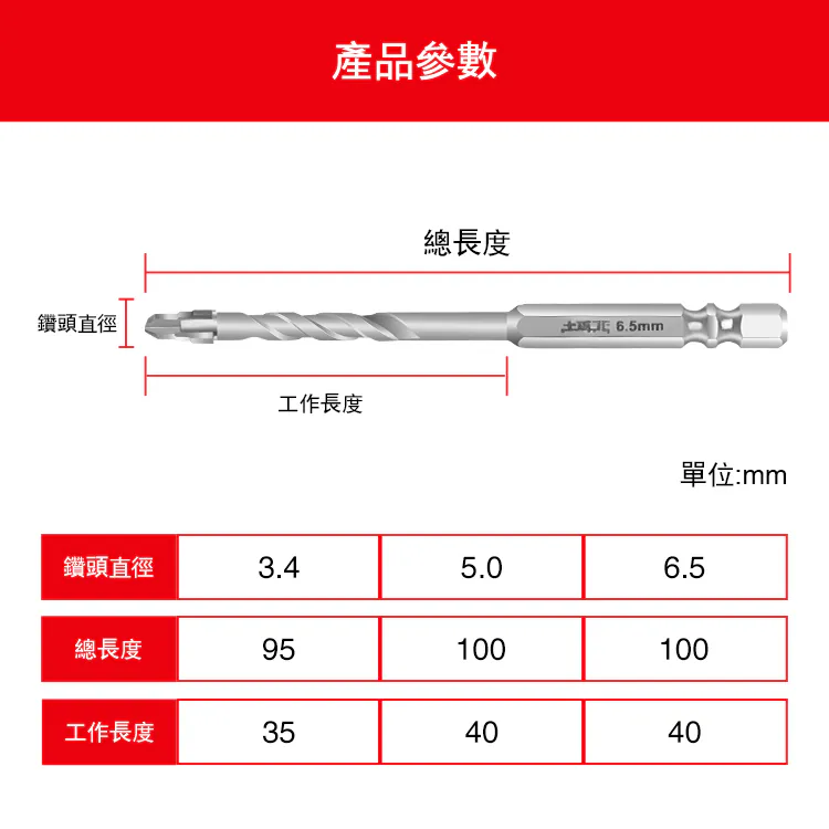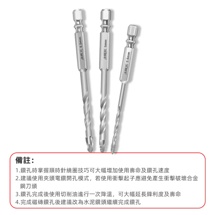 鑽孔過磁磚後之隔間牆或混凝土材質建議可改為水泥鑽頭繼續施工可延長本鑽頭使用壽命