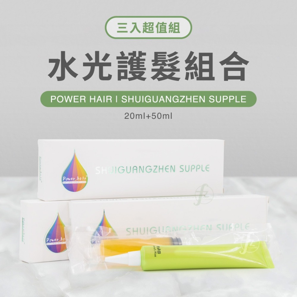 清洗完頭髮後將頭髮擦至六分乾,分區由下往上分片塗抹黃金水光精華液(金黃色),用指縫夾拉全區頭髮3~5次,噴少許水後再夾拉2~3次,重複操作約5分鐘,再取蛋白保養素(綠色)分區塗抹均勻,靜置8~10分鐘用溫水洗淨即可。