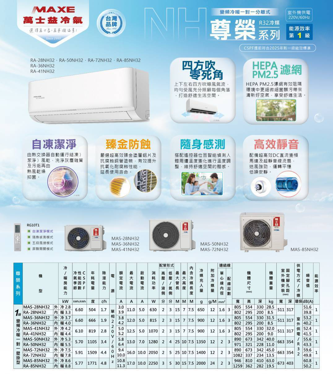 【MAXE 萬士益】MAS-85NH32/RA-85NH32(含基本安裝) NH32尊榮系列 一級變頻冷暖分離式冷氣