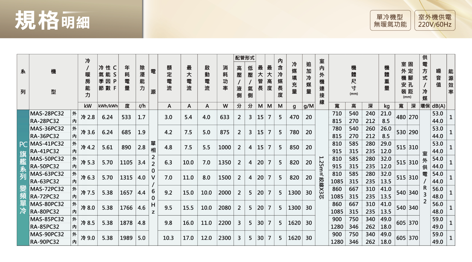 【MAXE 萬士益】MAS-28PC32/RA-28PC32(含基本安裝) PC32旗艦系列 一級變頻冷專冷氣