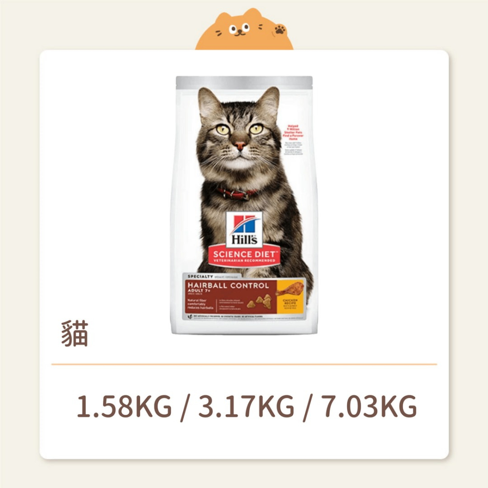 貓咪體內自然會形成毛球,但如果發生頻率比預期高,高齡貓可能需要採用營養方案解決此問題。希爾思寵物食品毛球控制7歲以上高齡貓乾糧營養配方有助於避免高齡貓體內毛球形成。此款貓用食品內含維持精實肌肉所需的優質蛋白質,以天然食材製成,採用Omega-3和Omega-6脂肪酸滋潤貓貓的皮膚和毛髮,同時提供必要的牛磺酸維持高齡貓的腎臟和心臟健康。