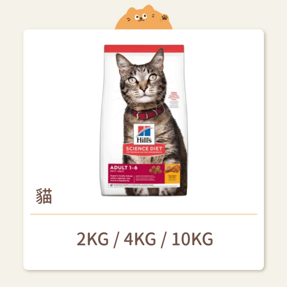成貓的食品應能夠增進消化健康、毛髮亮澤、精實肌肉和免疫力。希爾思寵物食品成貓乾糧以優質、易消化的食材製成,特調配方可滿足貓咪在生命力最旺盛階段的能量需求。以天然食材製成,提供維生素E、Omega-3和Omega-6脂肪酸滋潤愛貓的皮膚。此款優質貓用食品內含優質蛋白質,幫助成貓維持精實肌肉。此外,小顆粒乾糧提供成貓必備的牛磺酸和均衡礦物質,增進心臟健康,以及膀胱和腎臟功能。