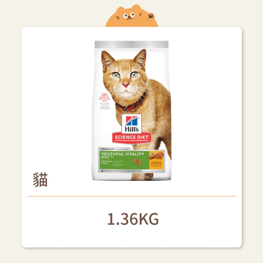 希爾思投入超過10年,研究營養對於寵物細胞功能影響。我們發現老化過程十分複雜,會造成寵物心智及生理遲緩。希爾思的精確營養,能幫助寵物老化時依舊維持健康及細胞機能。我們依據此發現研發配方。 - 獨家複合營養配方,有助於腦部健康、互動能力、精力與活力 - 維生素E及Omega-6脂肪酸,促進皮毛健康 - 易消化食材促進消化健康 - 支持每日活力充沛、行動靈活