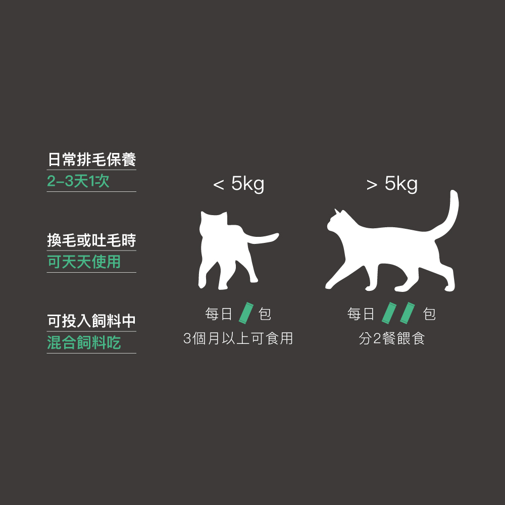 ● 食用方式:可直接給貓咪食用或拌入食物中餵食。若想幫貓咪固定清除毛球,可一周餵食3-4天;若 貓咪需要大量排毛,可天天食用。