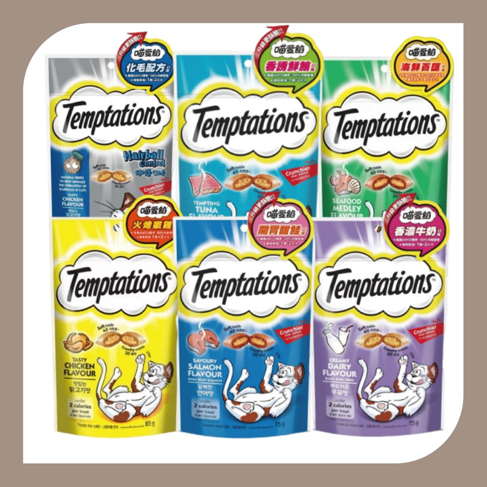 雞肉副產品、玉米、牛脂、牛血漿、米、小麥麵粉、香料、乾燥酵母、礦物質、維生素、二氧化鈦、奶粉、牛磺酸、鹽、抗氧化劑(丁基羟基甲苯、二丁基羟基甲苯)、起司粉