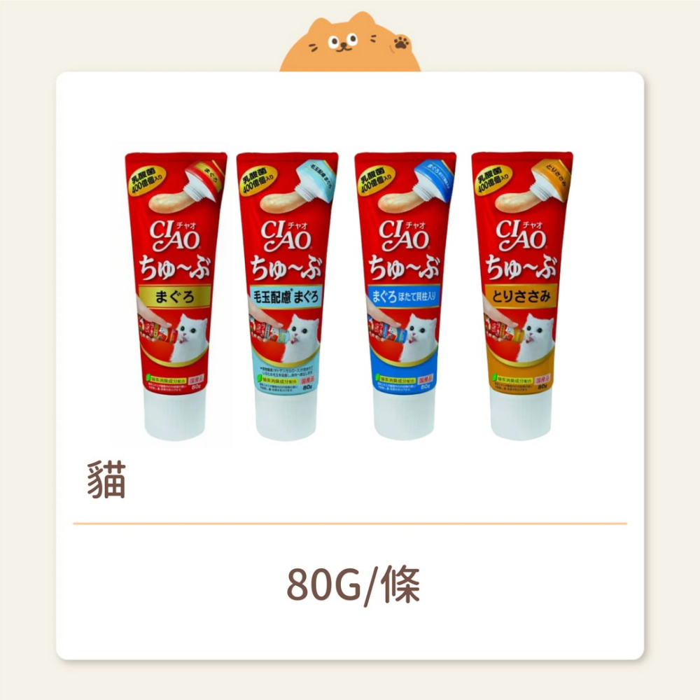 鮪魚、干貝口味 80g 成分: 鮪魚、干貝抽出物、干貝、糖類(Oligo糖等)、殺 菌乳酸菌、植物油、增稠劑(加工澱粉)、礦物質類、增稠 多糖類、調味料(胺基酸)、牛奶鈣、維他命E、紅麴色 素、綠茶抽出物