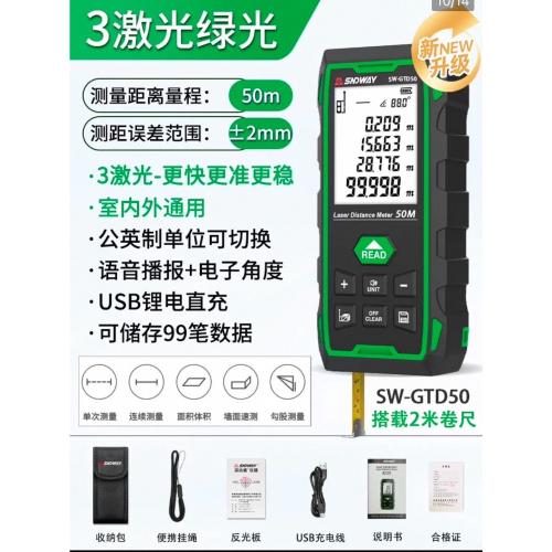 測量範圍:0.05-50M/100M+2米捲尺精確度:±2mm