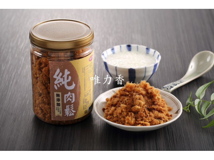以上等豬後腿肉為原料,搭配嚴謹的製程,呈現出完美的肉質與豐富的口感。豬肉原汁原味,不添加豆粉、防腐劑、色素,保留肉質的鮮美,每一口都是對品味的極致追求。將「純豬肉鬆」搭配白飯、麵包、吃粥拌飯或夾土司、包壽司,簡單一口,即可感受到肉香四溢的美好滋味。