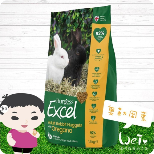 魏啥麻-(伯爵) Burgess Excel 成兔奧勒岡葉 1.5kg(味道較重 添加維生素 礦物質 益生元)兔飼料