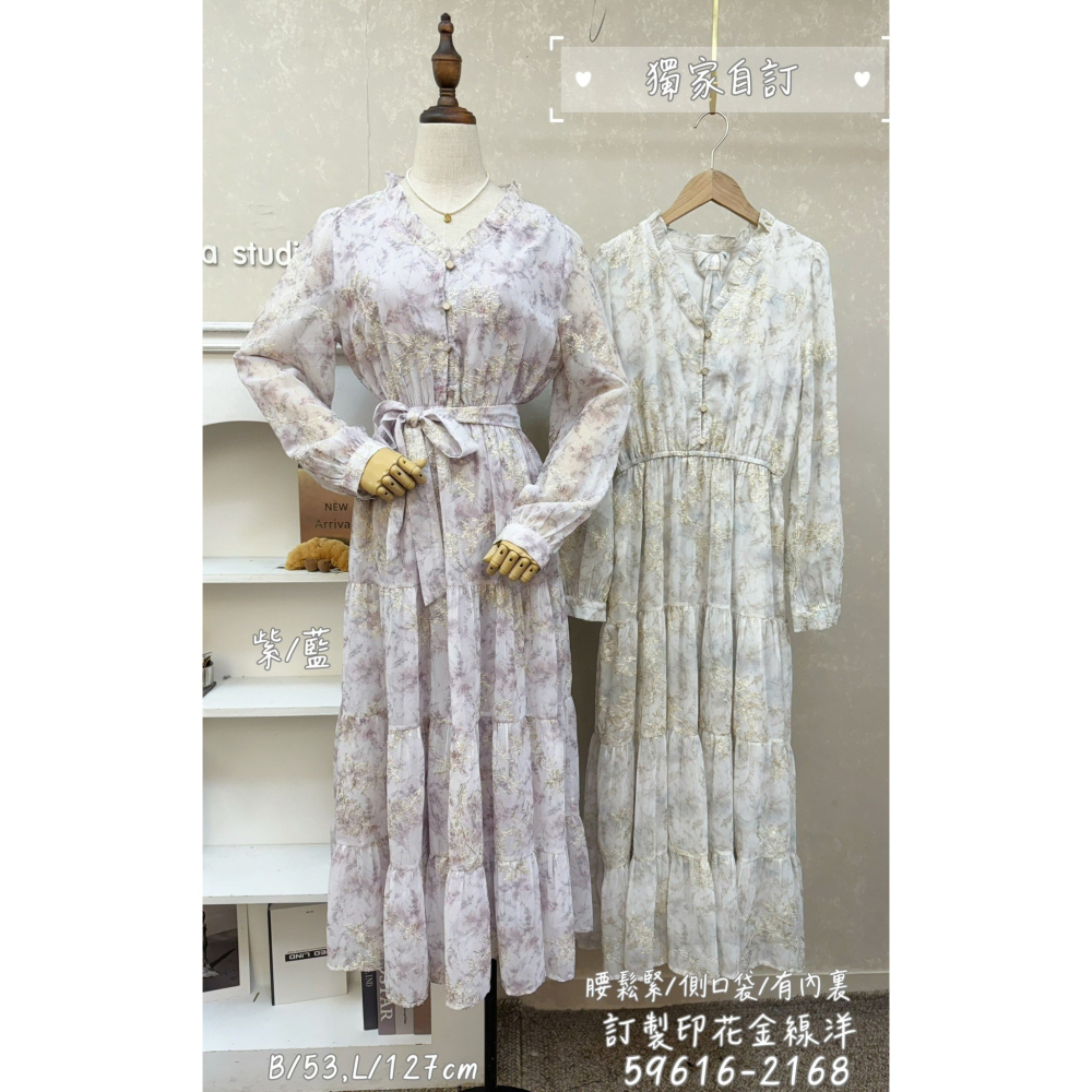 獨家訂製印花金線雪紡長洋裝 紫$990