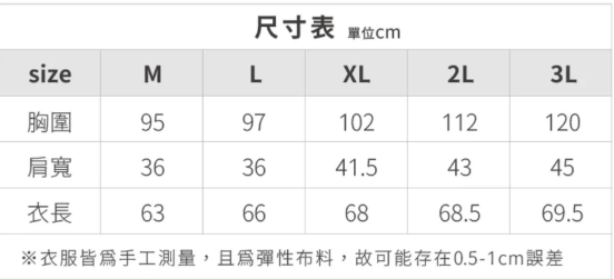尺寸:M、L、XL、2L、3L ( 詳情請見下方圖片 )