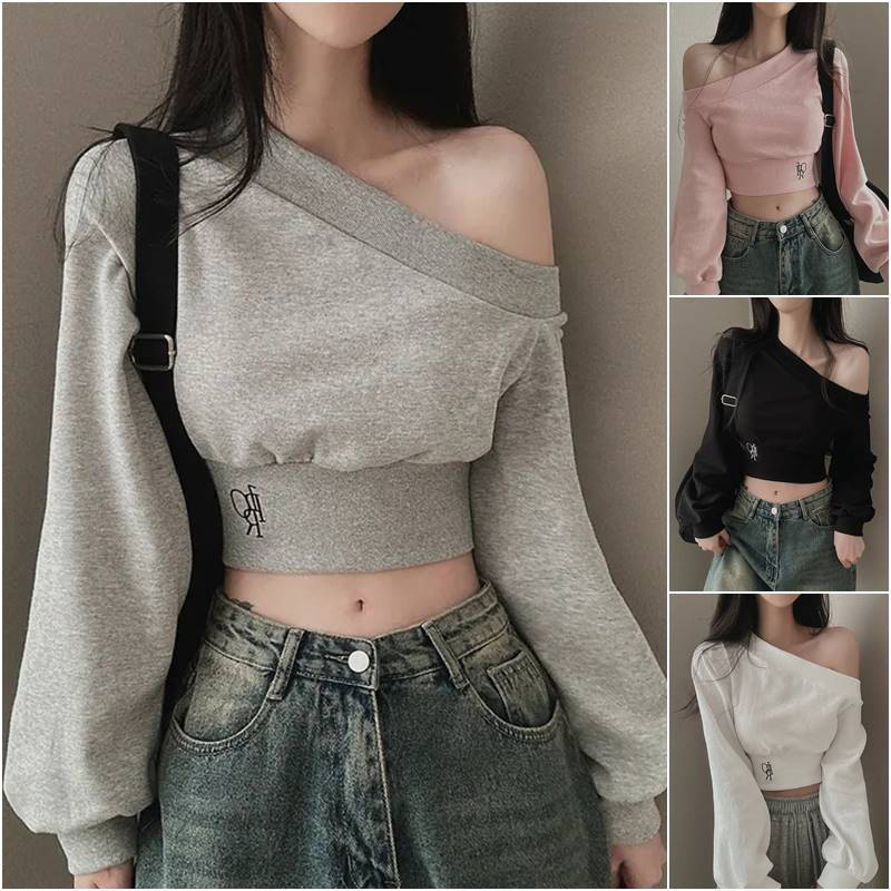☃️秋冬不規則斜領露肩收腰短款衛衣