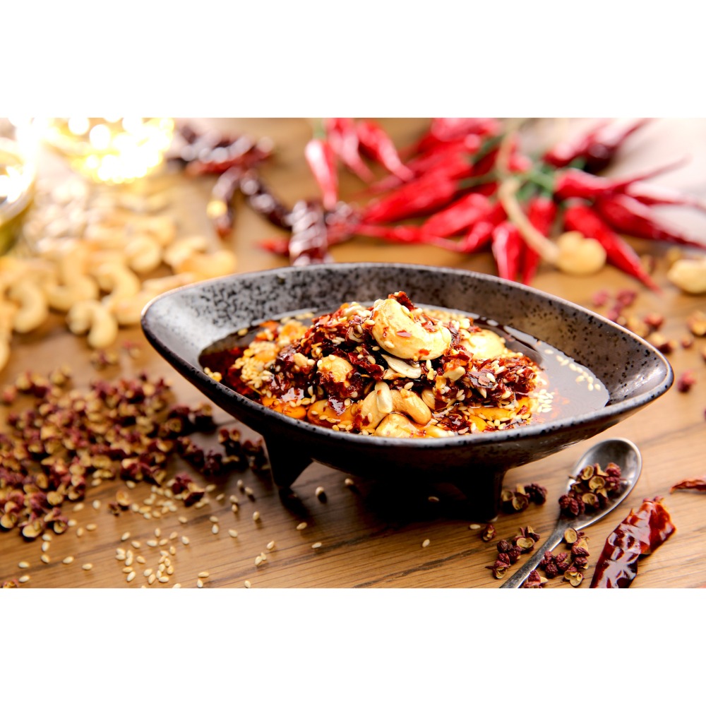 嚴選堅果與辣椒、花椒組合而成的獨特調味醬。入口香、脆、麻一口接一口無法停下。