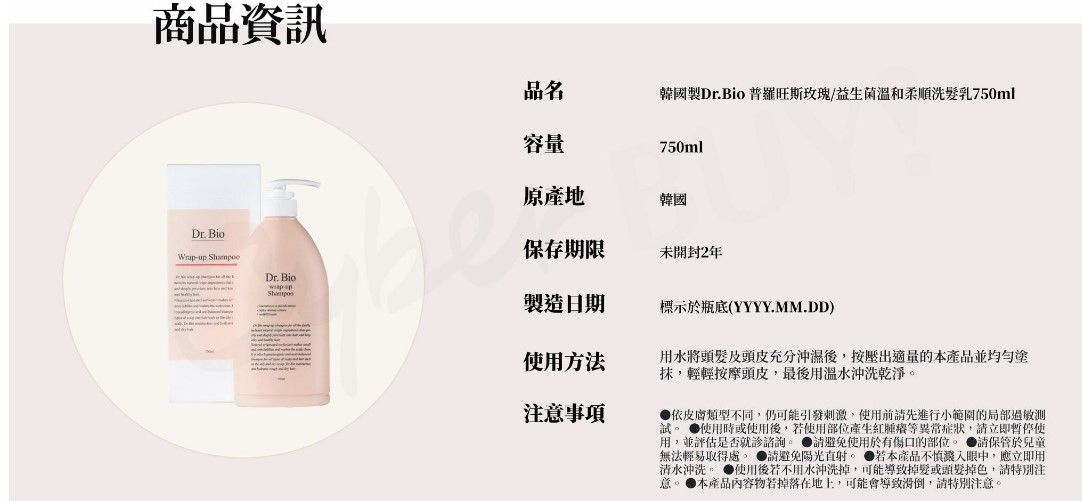 韓國製Dr.Bio 普羅旺斯玫瑰/益生菌溫和柔順洗髮乳750mL