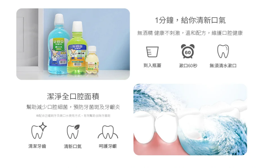 使用方法:成人10~20CC,兒童5~10CC,口含內漱60秒