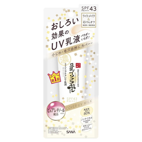 SANA莎娜豆乳美肌系列的「おしろい効果のUV乳液」(蜜粉效果UV乳液),也稱為「なめらか本舗リンクルUV乳液」(豆乳美肌抗皺UV乳液)。 它是一款結合了護膚與底妝功能的日間防曬乳液。