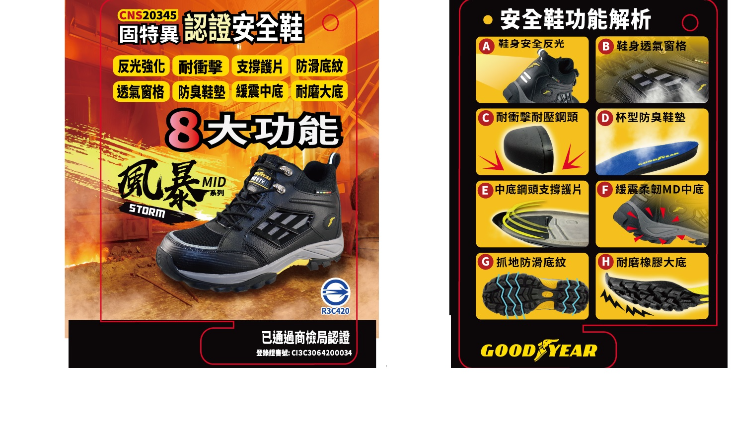抓地耐磨大底 耐衝擊耐壓鋼頭 前掌柔韌易彎折 抗菌防臭鞋墊 夜間安全反光 鞋身透氣網布