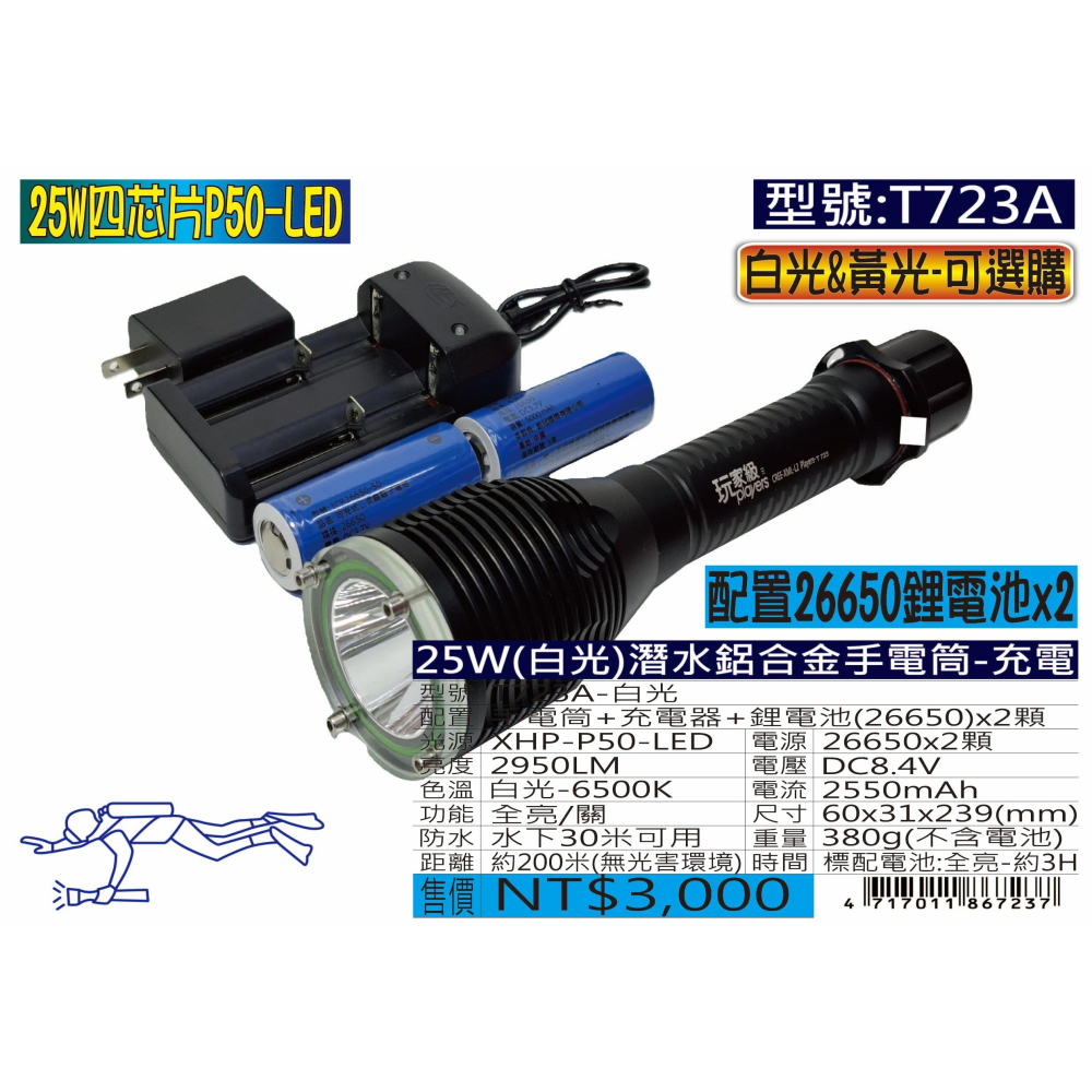 T723A-25W(白光)潛水-鋁合金手電筒(充電組)