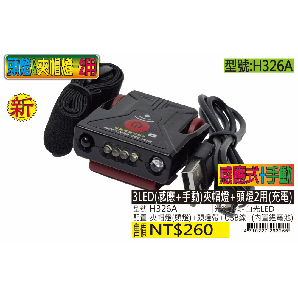 H326A-3LED(感應+手動)夾帽燈+頭燈2用(充電)