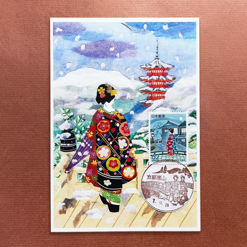 風景印圖樣:描繪嵐山渡月小橋與前往「十三參拜」的少女