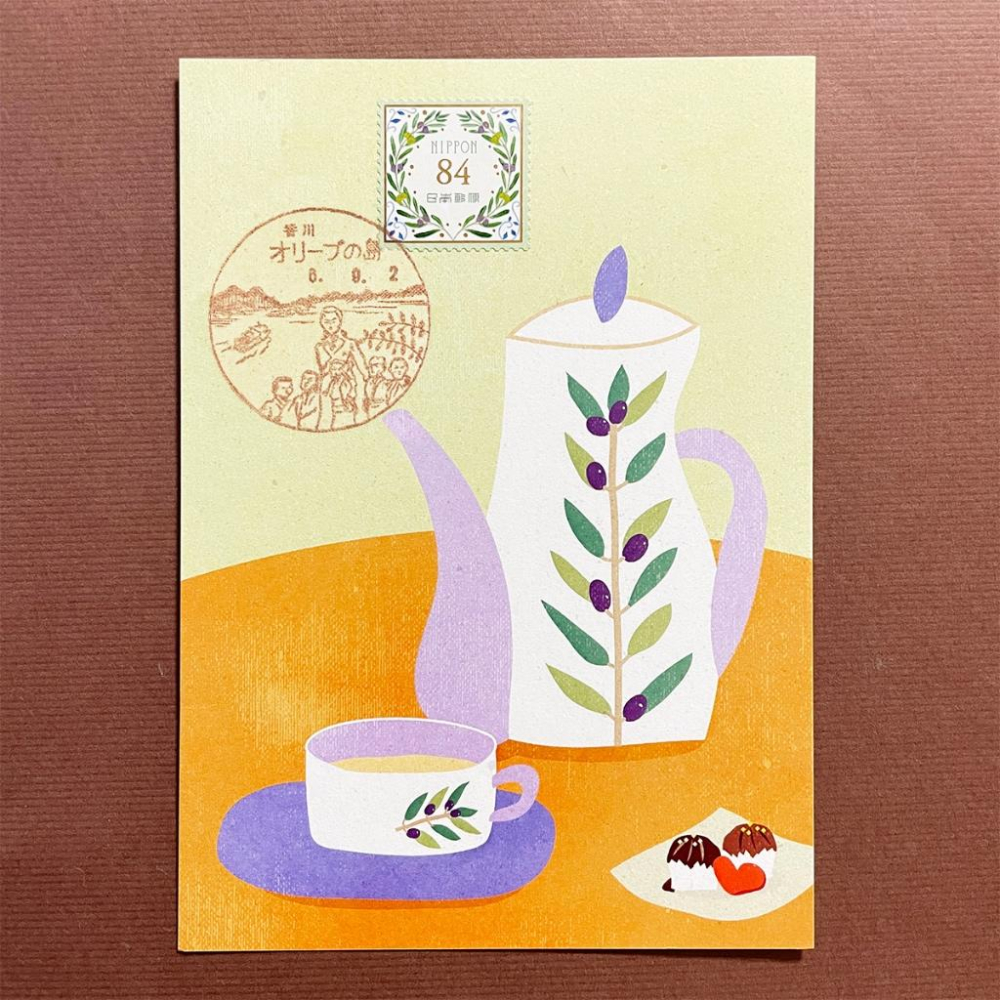 風景印圖樣:以小說《二十四瞳》為題所創作的「和平之群像」雕塑、小豆島特產橄欖、土庄港