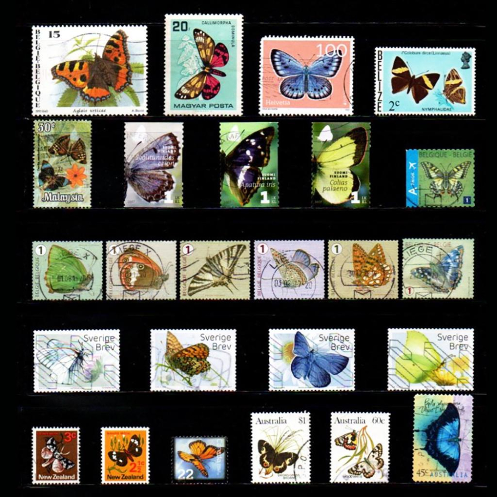 各國蝴蝶郵票,共有比利時8枚、匈牙利1枚、瑞士1枚、貝里斯1枚、馬來西亞1枚、芬蘭3枚、瑞典4枚、紐西蘭2枚、加拿大1枚、澳洲3枚,合計共25枚。